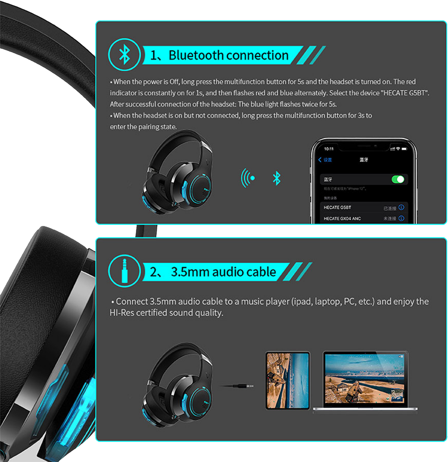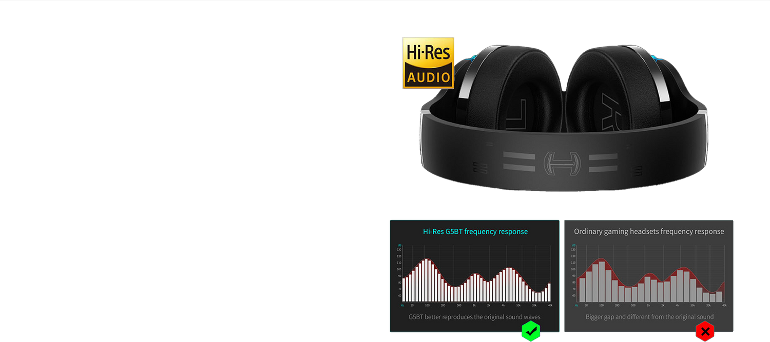 The G5BT gaming headset features top-notch audio technology, elevating the resolution to 24bits/96KHz for a much more detailed, richer soundscape. To enjoy Hi-Res lossless sound, a 3.5mm audio cable is required, and make sure your terminal supports the high-resolution standard.