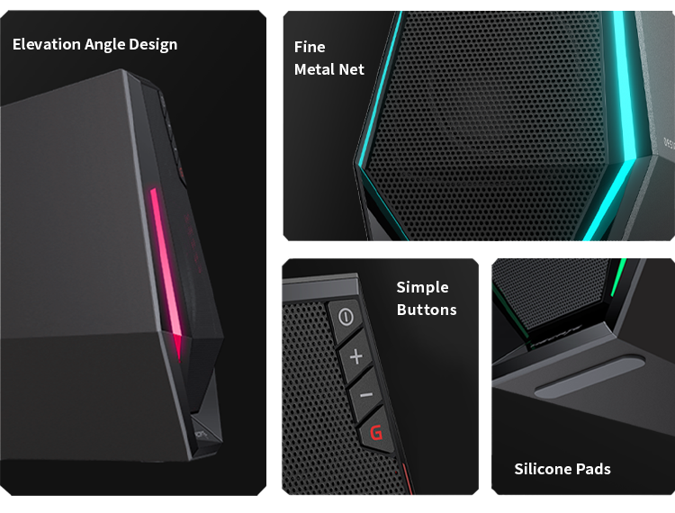 Elevation Angle Design, 10% golden elevation angle, to reduce sound refraction.Fine Metal Net, Robust esports power, heat loss reduced. Simple Buttons, Convenient and comfortable. Silicone Pads, Anti-slip and anti-fall, no dyeing.