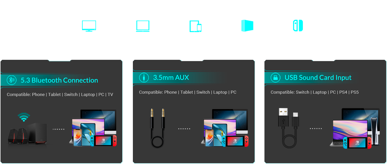 Le G1500 MAX offre une connexion sans fil fiable grâce au Bluetooth 5.3. Ce système d'enceintes intègre également une carte son USB et une entrée AUX, garantissant ainsi la compatibilité avec divers appareils. Passez facilement d'une interface à l'autre grâce au câble USB-C vers USB-A.