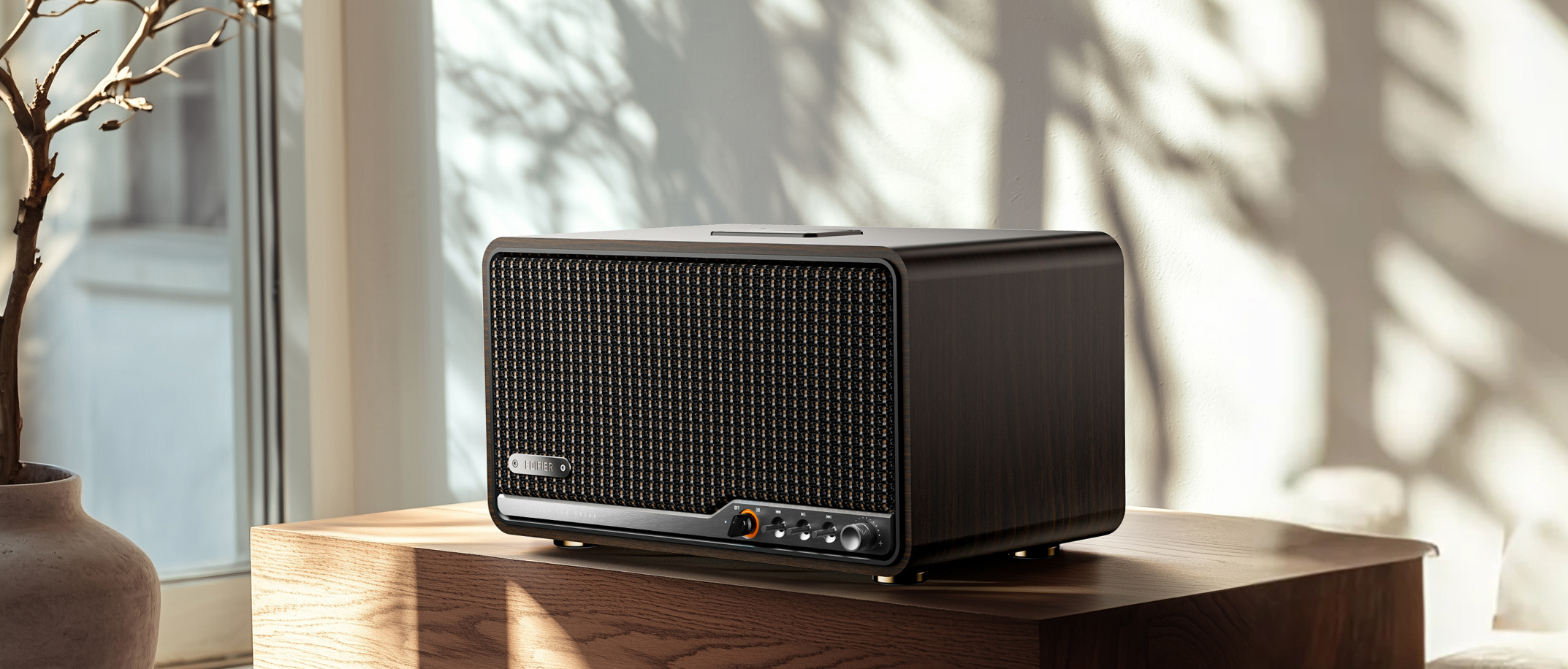 The S300 blends retro charm with contemporary flair. Featuring a handcrafted wooden cabinet, braided speaker grille, and sleek metal controls, its timeless design complements any décor effortlessly.