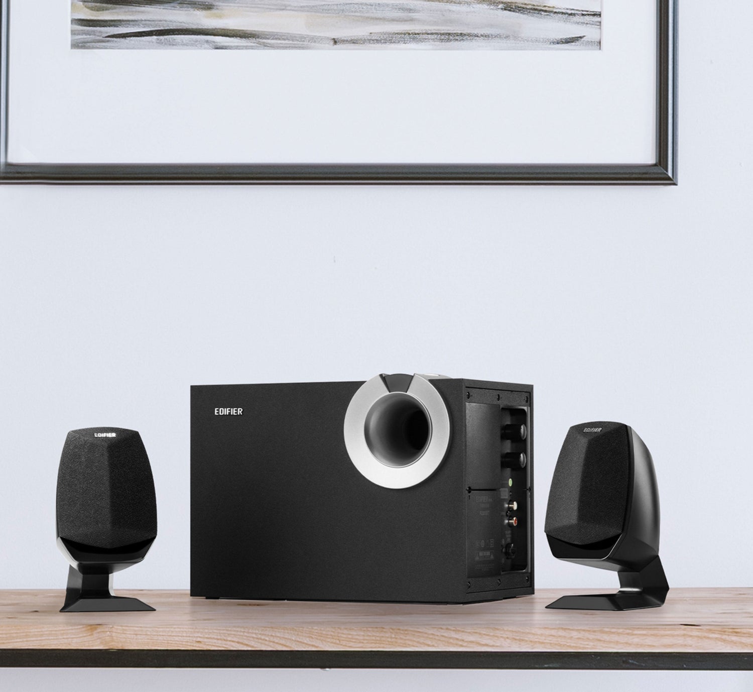 Le système comprend deux haut-parleurs satellites de 84 × 153 × 103 mm / 3,3 pouces x 6 pouces x 4 pouces et un caisson de basses de 5 pouces de 161 × 200 × 280 mm / 6,3 pouces x 7,87 pouces x 11 pouces avec une puissance de crête de 68 watts. sortie pour créer une expérience audio large et complète.