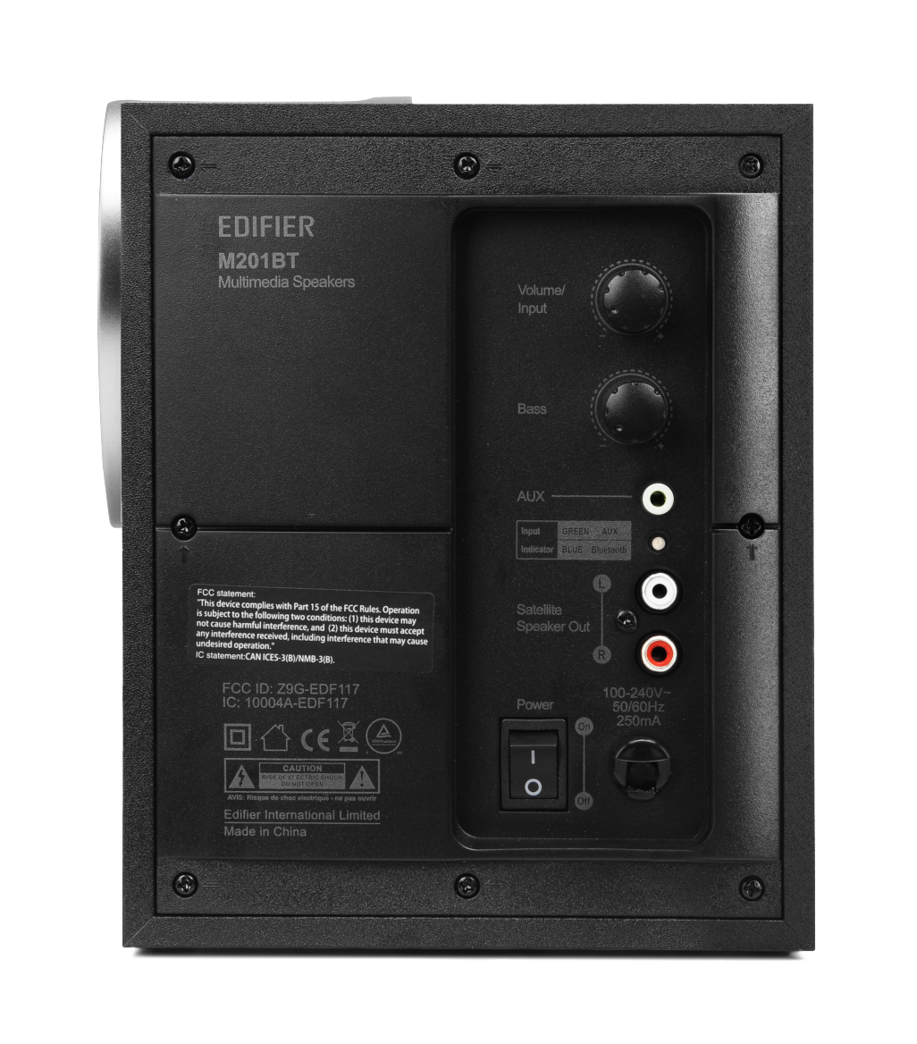 Les boutons qui incluent l'augmentation et la diminution du volume, la sélection de l'entrée et le réglage des basses sont tous situés sur le panneau latéral des haut-parleurs pour un contrôle et un réglage faciles.