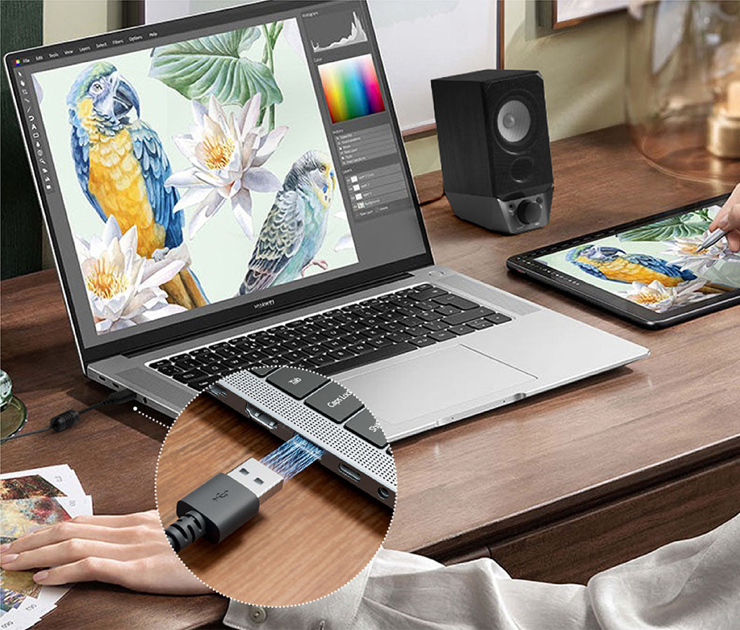 La carte son intégrée vous permet de vous connecter à votre PC via un seul câble USB. Dites adieu aux câbles multiples et gardez votre poste de travail organisé.