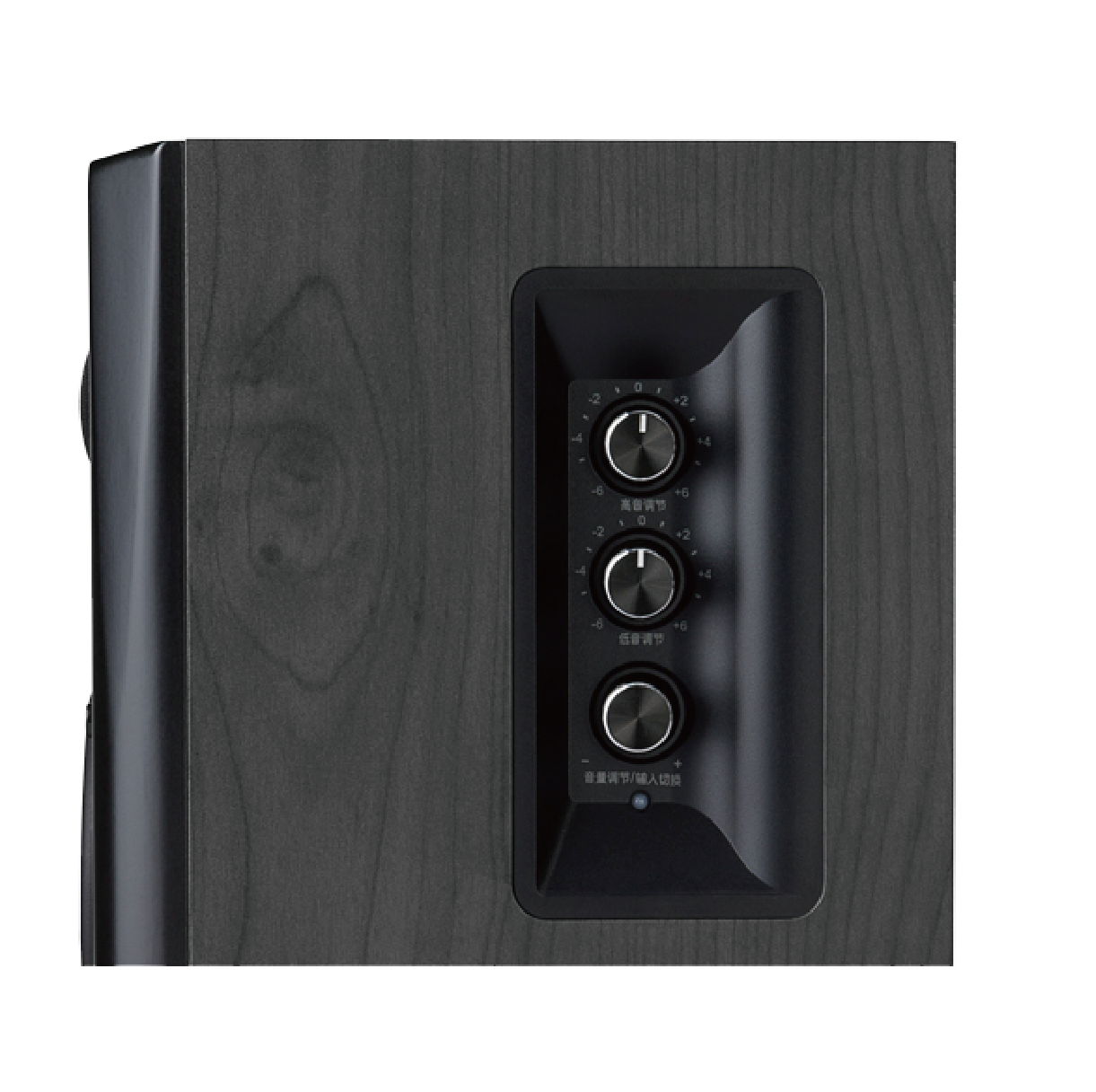 Prenez le contrôle total de votre audio grâce aux commandes du panneau latéral sur le côté de l'une des enceintes de bibliothèque. Trois boutons sont situés sur le côté et affectent les basses, les aigus et le volume de l'ensemble du système 2.1. Une fois allumé, le voyant d'alimentation apparaîtra pour vous indiquer que votre système fonctionne.