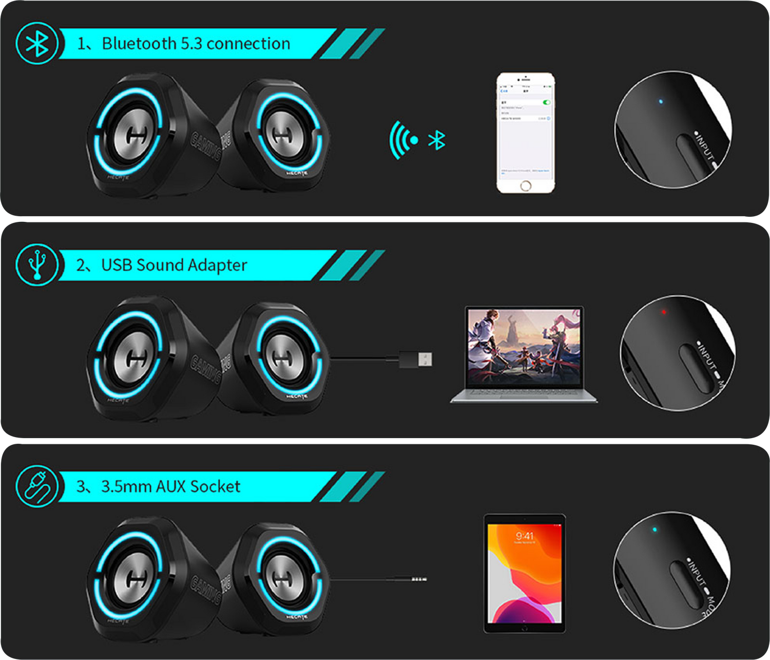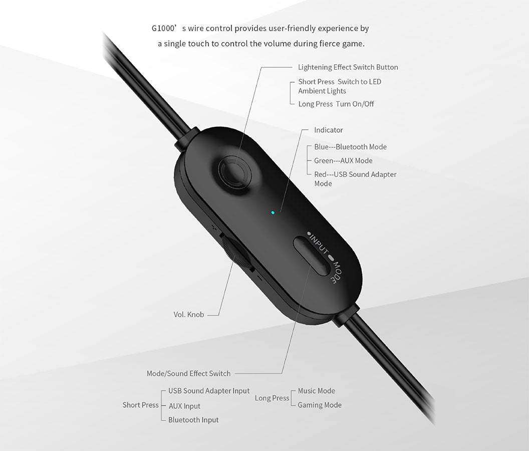 Les haut-parleurs de jeu disposent de commandes filaires simples pour offrir une expérience conviviale en contrôlant le volume, l'effet de lumière, le mode jeu ou musique, ainsi que les trois modes d'entrée, comme l'entrée de l'adaptateur audio USB, l'entrée AUX 3,5 mm et l'entrée Bluetooth 5.0. Avec différents indicateurs de couleur, vous pouvez savoir quel est le mode.