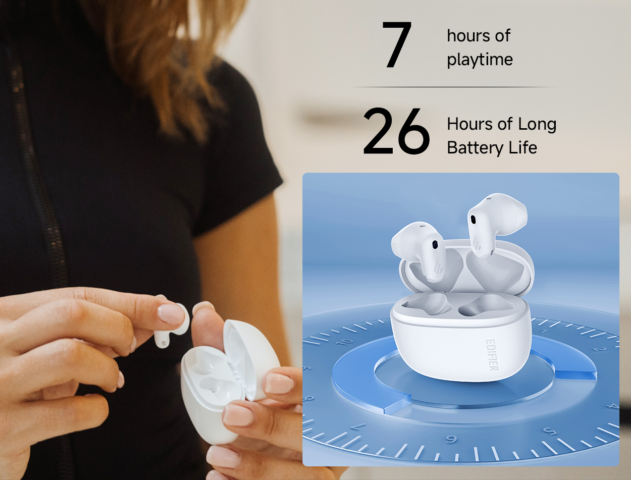 Profitez de 7 heures d'écoute avec une seule charge, plus 19 heures avec l'étui de charge, soit un total de 26 heures, pour une écoute musicale toute la journée. Charge rapide : 15 minutes de charge offrent 1,5 heure d'écoute.