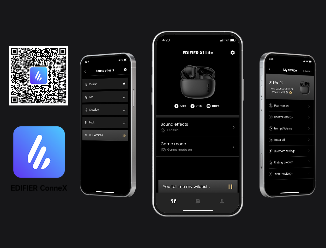 Téléchargez l'application EDIFIER ConneX pour explorer différents styles de musique, personnaliser les paramètres de contrôle, mettre à jour le micrologiciel, renommer vos écouteurs et localiser les écouteurs perdus.