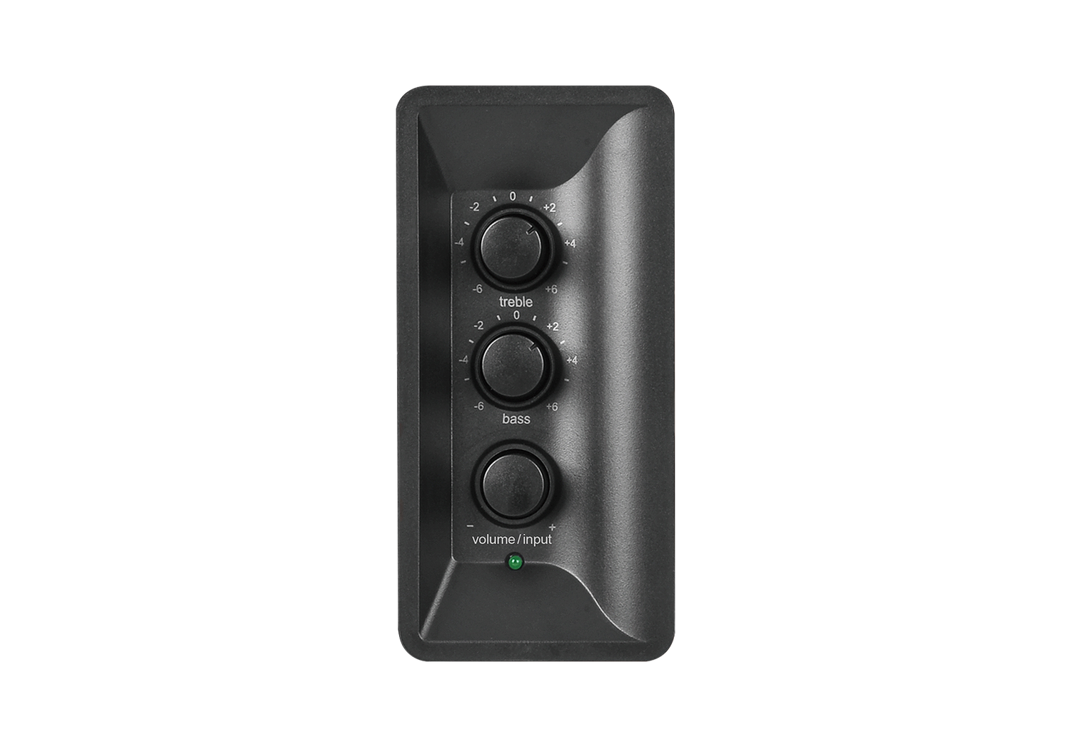 Convenient dials on the side panel of the speaker allow you to adjust the bass, treble, and volume to fit individual preferences, press the volume dial to toggle between inputs.